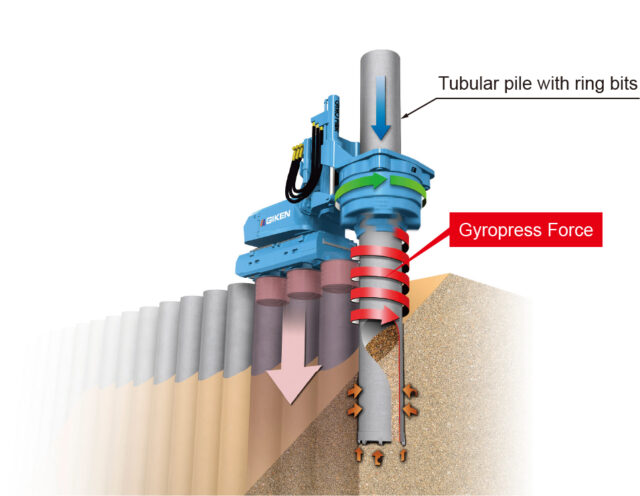 This method constructs a robust and resilient Implant Structure via rotary press-in of tubular piles fitted with ripping bits called “ring bits” at their tips, penetrating existing structures and hard ground. As the method can penetrate existing structures, there is no need to remove buried objects, and pre-excavation using excavators is unnecessary, thus reducing construction time and costs. Furthermore, as the lightweight and compact GYRO PILER™ tubular pile rotary cutting press-in machine firmly grips already installed piles, there is no risk of falling over thanks to the principle used, and construction can be carried out whilst suppressing vibration and noise, eliminating concerns about adverse effects on the surrounding environment.