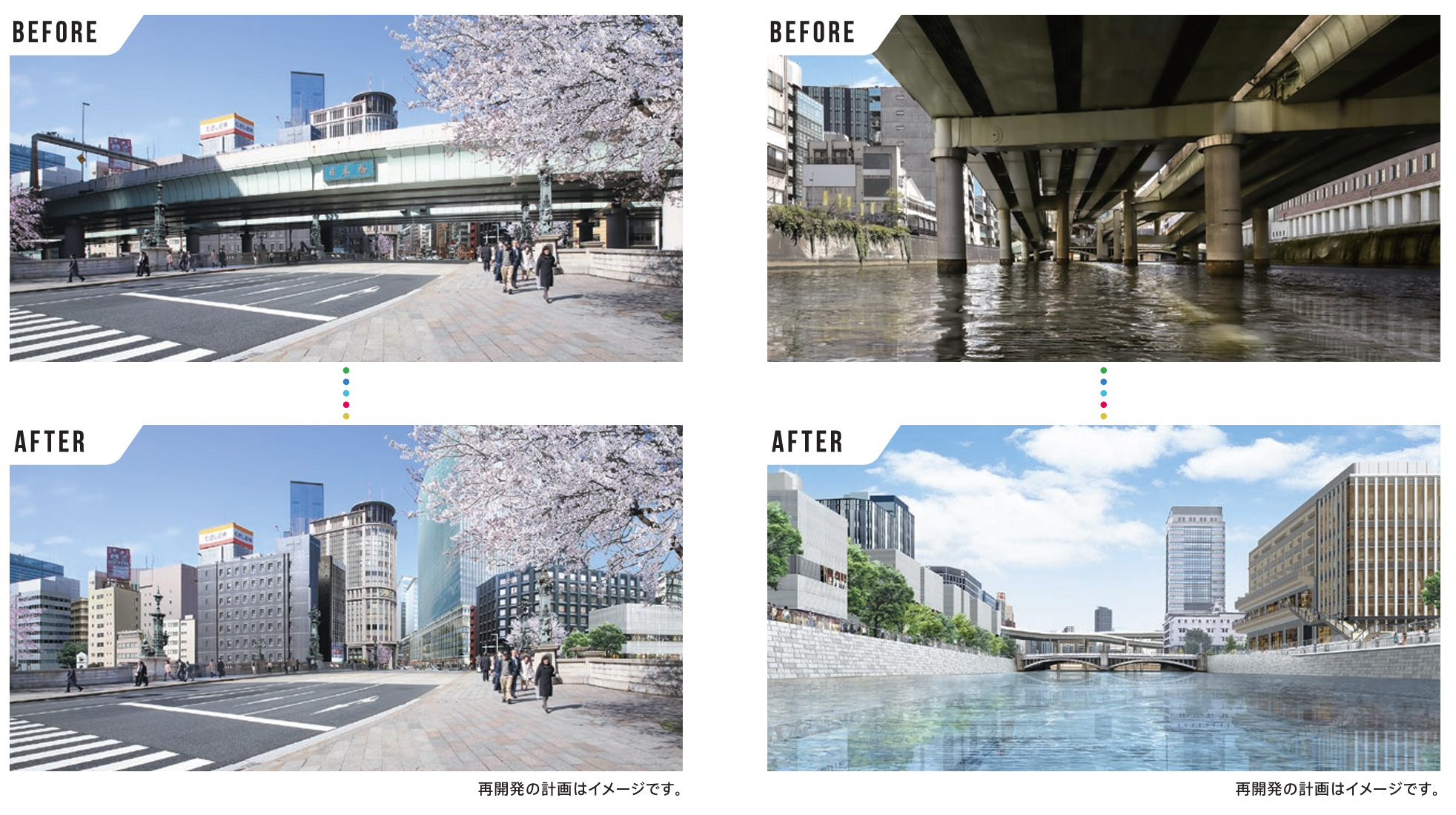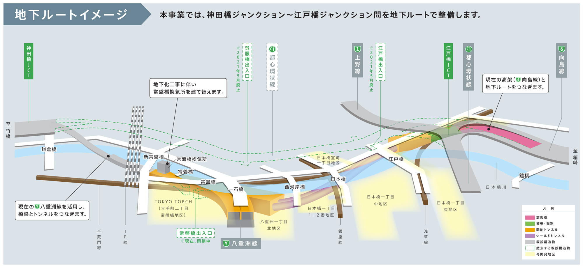 To handle the rapid expansion of the car-based society, the Shutoko was connected using an elevated viaduct over Nihonbashi River. However, the viaduct is aging, and in addition, some 100,000 vehicles pass over it a day, subjecting it to extreme conditions and hastening damage. For that reason, the decision was made in 2019 to create an underground route that would both ensure long-term safety and improve the scenery and environment around the Nihonbashi River. Specifically, a shield tunnel will be constructed underground in the area of the Nihonbashi River and connected to the Yaesu Line of the Shutoko which is already underground. In addition, the viaduct from the Kandabashi to the Edobashi junctions will be removed.