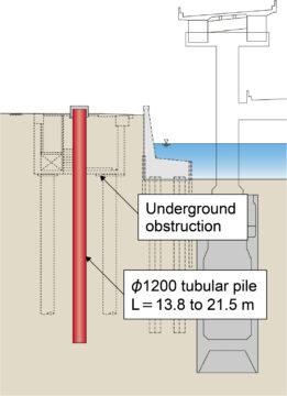 Using the Gyropress Method™, a tubular pile with ripping bits called “ring bits” is rotated and pressed in, penetrating without removing the assumed remains underground, allowing smooth construction of the retaining walls. This project also installed small diameter tubular piles to fill in gaps between the initial piles to stop the water.