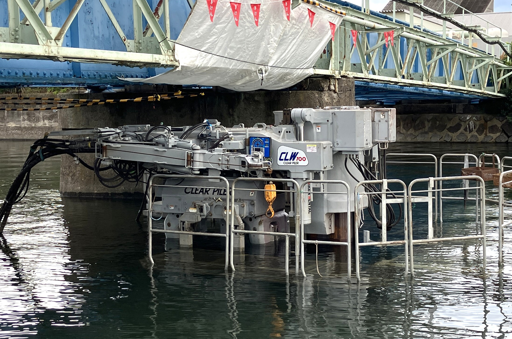 GIKEN LTD. announced the development of waterproof SILENT PILER™ pile press-in and extraction machine that can withstand flooding at river banks and coastal areas. The waterproof SILENT PILER™ carried out piling for the first time at a site. In recent years, dealing with rising water levels due to sudden torrential rains and such has become an issue in riverbank infrastructure maintenance and renovation projects in urban areas. In the past, when press-in machines were at risk of becoming submerged, it was necessary to interrupt the project, use cranes to lift the press-in machines so that they avoid being submerged, then redeploy them. Besides shortening construction periods by minimising such interruptions, this development increases the scenarios where piling is possible, allowing more flexible and efficient response in projects to deal with the aging of bridge piers, river revetments, and such.