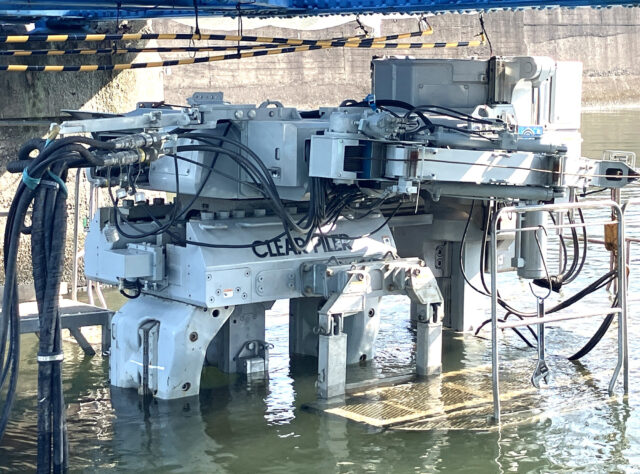 Based on SILENT PILER™, a low-headroom press-in machine for sites with overhead obstacles, the hydraulic and electrical components of the waterproof SILENT PILER™ were modified to make them waterproof. Currently, the waterproof SILENT PILER™ can withstand water up to a depth of 2 m and water pressure up to 0.02 MPa. With a view of launching it in the market, it was used by Group company GIKEN SEKO CO., LTD. to carry out piling for the first time at the site of the Oe River Renovation Project in Nagoya. Under conditions where the difference between high and low tides was 2.3 m and the saddle* was submerged during high tides, the cut-off walls were completed without removing any machinery.