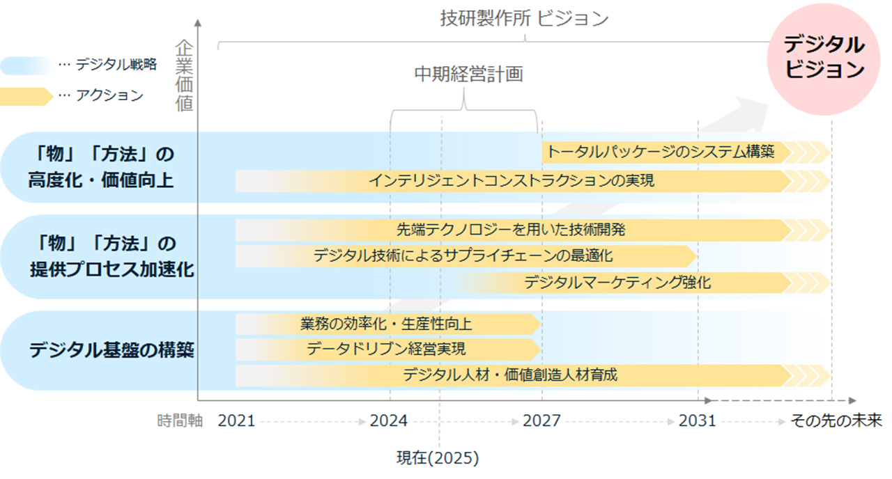 中期経営計画やビジョンと連動させた、デジタルビジョン実現のための中長期的なロードマップを策定しています。