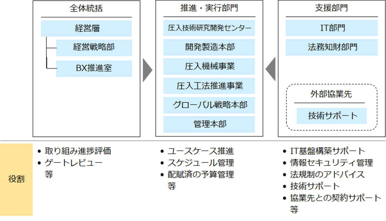 経営層、経営戦略部、BX推進室、各事業、支援部門と連携を強化し、事業横断でDX推進を目指します。また、先端テクノロジーを用いた技術開発を推進するため、積極的に外部組織との協業を進めていきます。