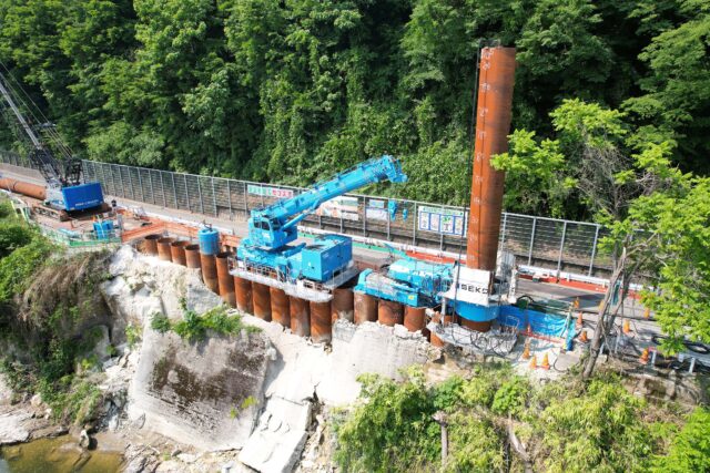 当該現場は河川に隣接した狭隘地であり、交通インフラの維持と早期復旧が強く求められていました。そこで、仮設工や通行制限を最小限にすることができる「ジャイロプレス工法™」「GRBシステム™」を採用し、被災箇所に対して鋼管杭を回転切削圧入することで自立式山留め擁壁を構築しました。