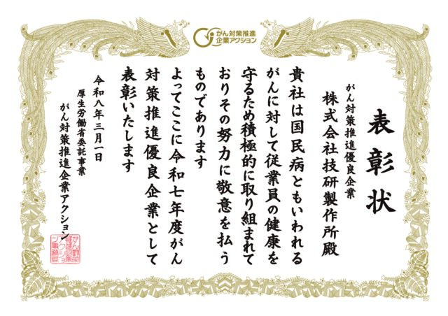 株式会社技研製作所は、厚生労働省が推進する「がん対策推進企業アクション」において、令和7年度「がん対策推進優良企業」として表彰されました