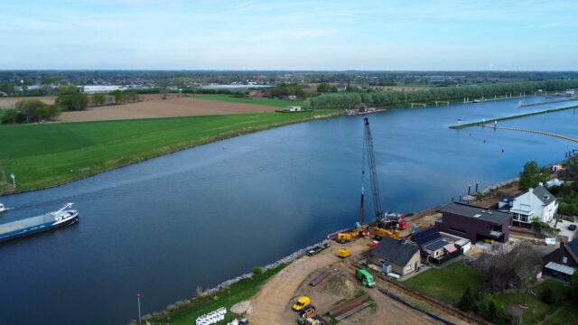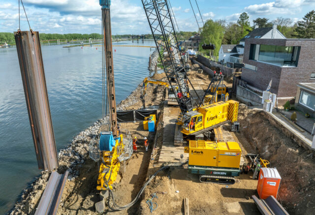 本件は、オランダの国家的治水対策事業「デルタプログラム」※1の一環であり、フランス、ベルギー、オランダを通り、最終的に北海へと注ぐ国際河川のマース川の堤防を強化するものです。デルタプログラムにおいては、すでに本区間外でも当社工法が採択されています。今回は、当社グループ企業の技研ヨーロッパ(Giken Europe B.V./本社:オランダ、社長:山本卓也)が、「GTOSS™ EUROPE」※2会員でもある施工業者のSterk BV(ステルク社)に対し、技術指導員の派遣、関連製品のレンタルを行い、硬質地盤における擁壁護岸※3の構築をサポートしました。