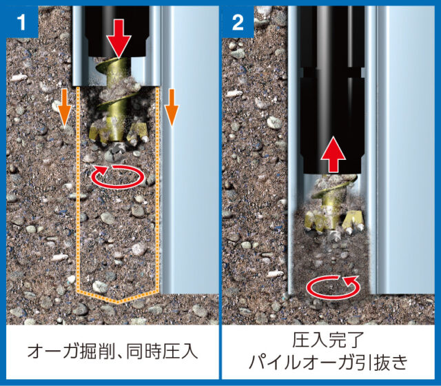 「サイレントパイラー™」にパイルオーガを装着し、圧入とオーガ掘削を連動させた独自の「芯抜き理論」で硬質地盤に鋼矢板を圧入する工法です。無振動・無騒音施工、省スペース施工をはじめとする圧入技術の優位性を損なうことなく、玉石混じりの砂礫層や岩盤などにも圧入できます。