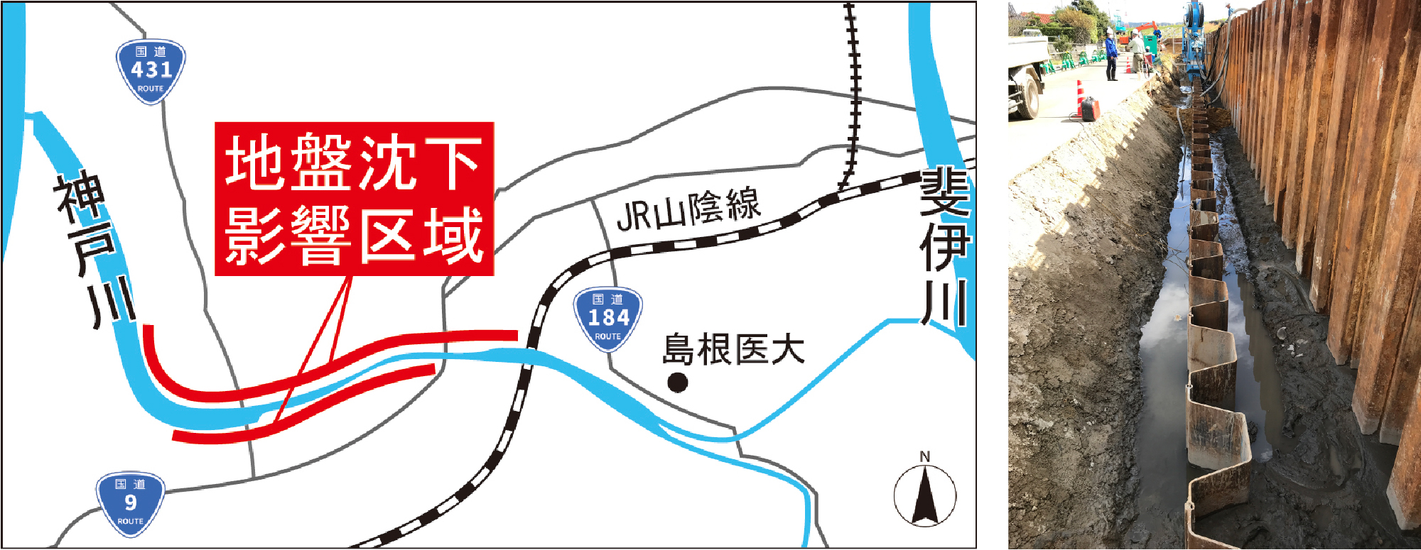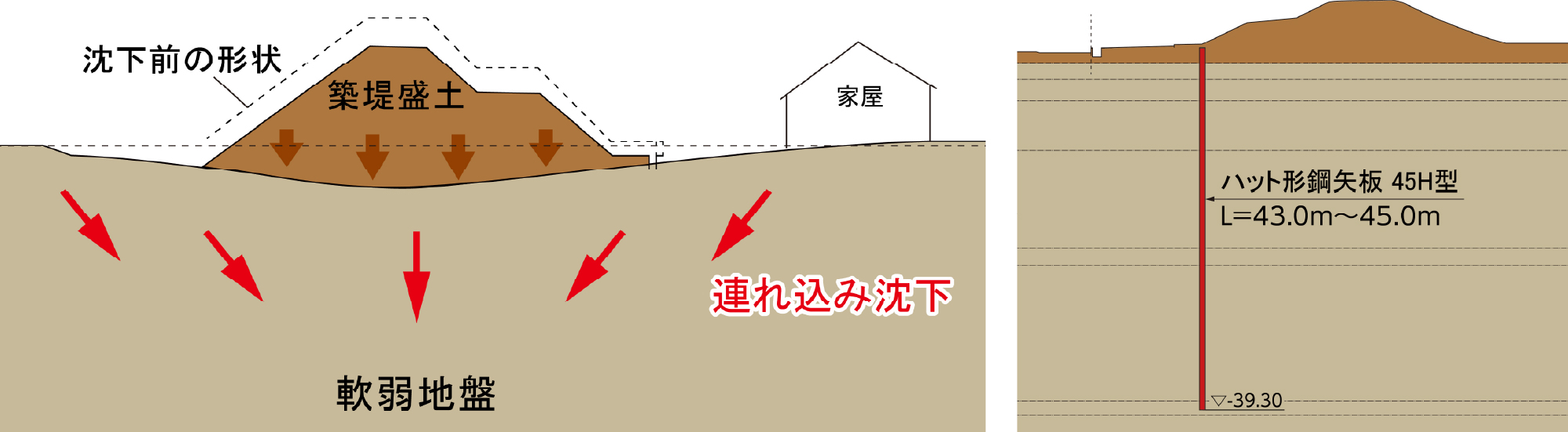 このため、ハット形鋼矢板を列状に設置することで地中に「仕切り」を作り、さらなる連れ込み沈下の発生を抑止する対策工事が進められてきました。