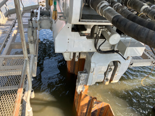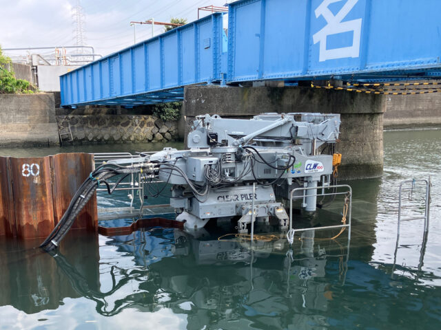 頭上に障害物がある現場に対応する低空頭専用機種の「クリアパイラー™」をベースに、油圧機器や電装部品を防水仕様に改良。現段階では水深2m、水圧0.02MPaまで耐えることが可能です 。市場への投入を見据え、グループ企業の株式会社技研施工(本社:高知市、代表取締役社長 CEO:西川昭寛)が名古屋・大江川改修工事で初めて現場施工を行いました。干満差2.3m、満潮時にはサドル※部分が水に浸かってしまうような条件下で、機械を撤去させることなく止水壁を完成させました。