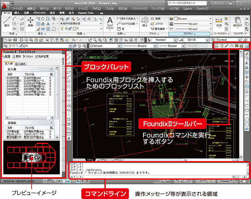 FoundixⅡは、圧入に特化した作図機能・機械パーツを備えた、圧入施工図面専用のCADパッケージです。FoundixⅡ独自機能とAutoCADの持つ機能の融合により、基本的な操作の習得だけで、完成度の高い圧入施工図面が効率的に作成できます。