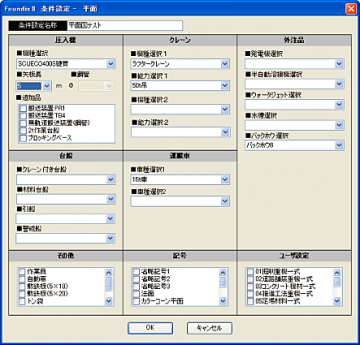 1.平面用または側断面用の条件設定ダイアログに、必要な機材を選択または数値入力します。