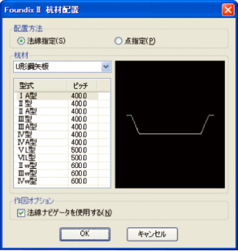 杭材の種類、型式を選択し、法線または任意の点を指定することで自動的に杭材が連続配置されます。