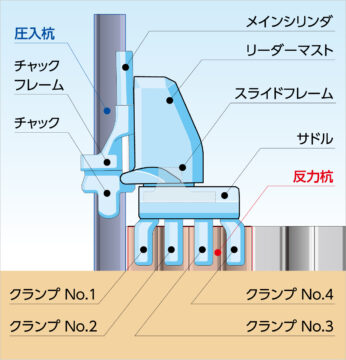 反力杭をつかむための部位。圧入施工の進行方向に向かって一番前方にあるクランプをNo.1とし、後方へ順にNo.2、No.3、No.4と呼称します