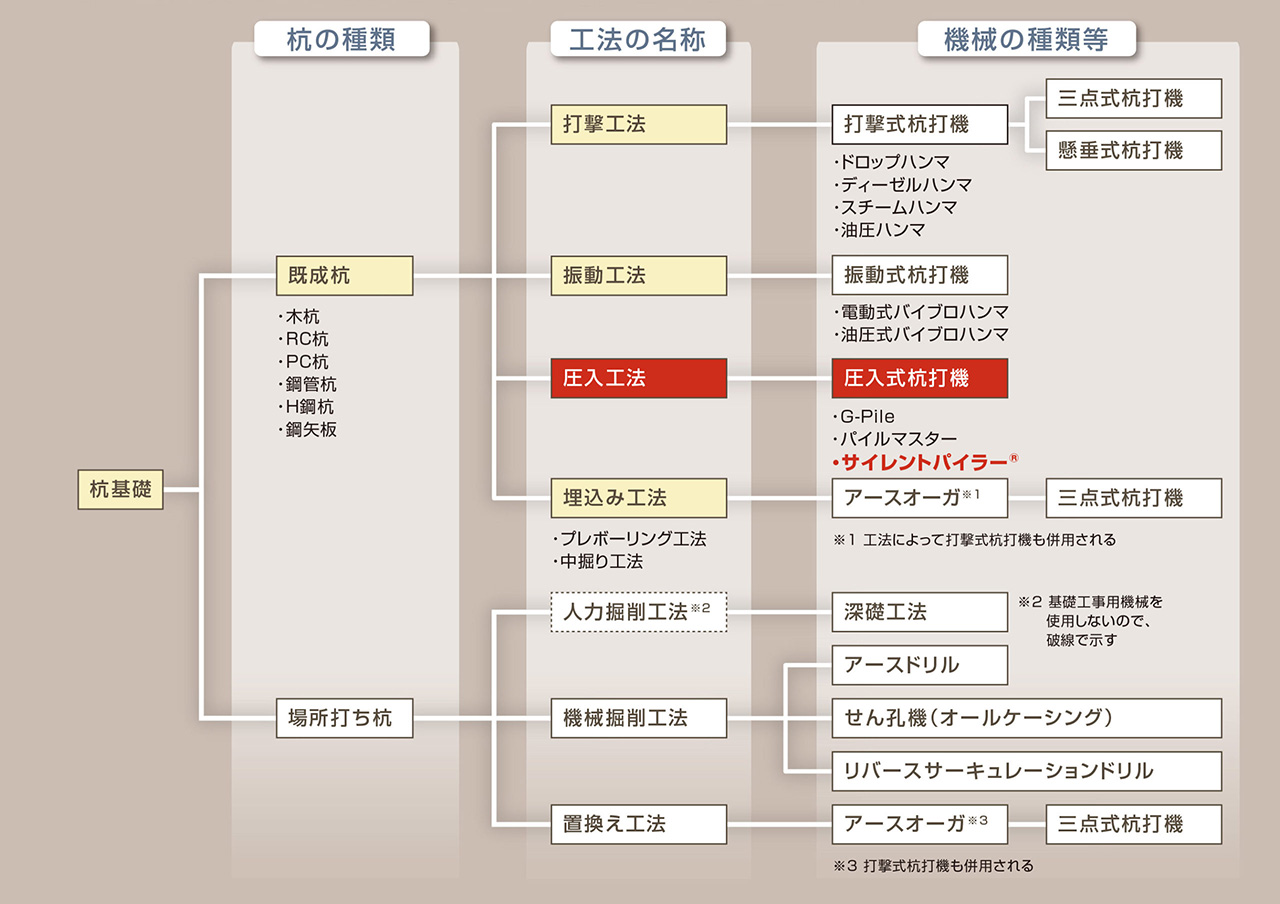 すでに地中に押し込まれた杭/矢板を数本つかみ、その引抜抵抗力を反力として次の杭を油圧による静荷重で地中に押し込む「圧入原理」を世界で初めて実用化したのが、1975年に当社が発明した油圧式杭圧入引抜機「サイレントパイラーTM」です。