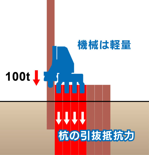 一方、サイレントパイラーは既に打ち込まれた杭を数本つかみ、その引抜抵抗力で機体を安定させ、油圧による静荷重で杭を押し込んでいきます。「引き抜く力」を「押し込む力」に転用しているため、サイレントパイラーは軽量な機体重量でも100t 以上の力を発揮できるのです。静荷重で杭を押し込むため、無振動・無騒音で施工することができます。
