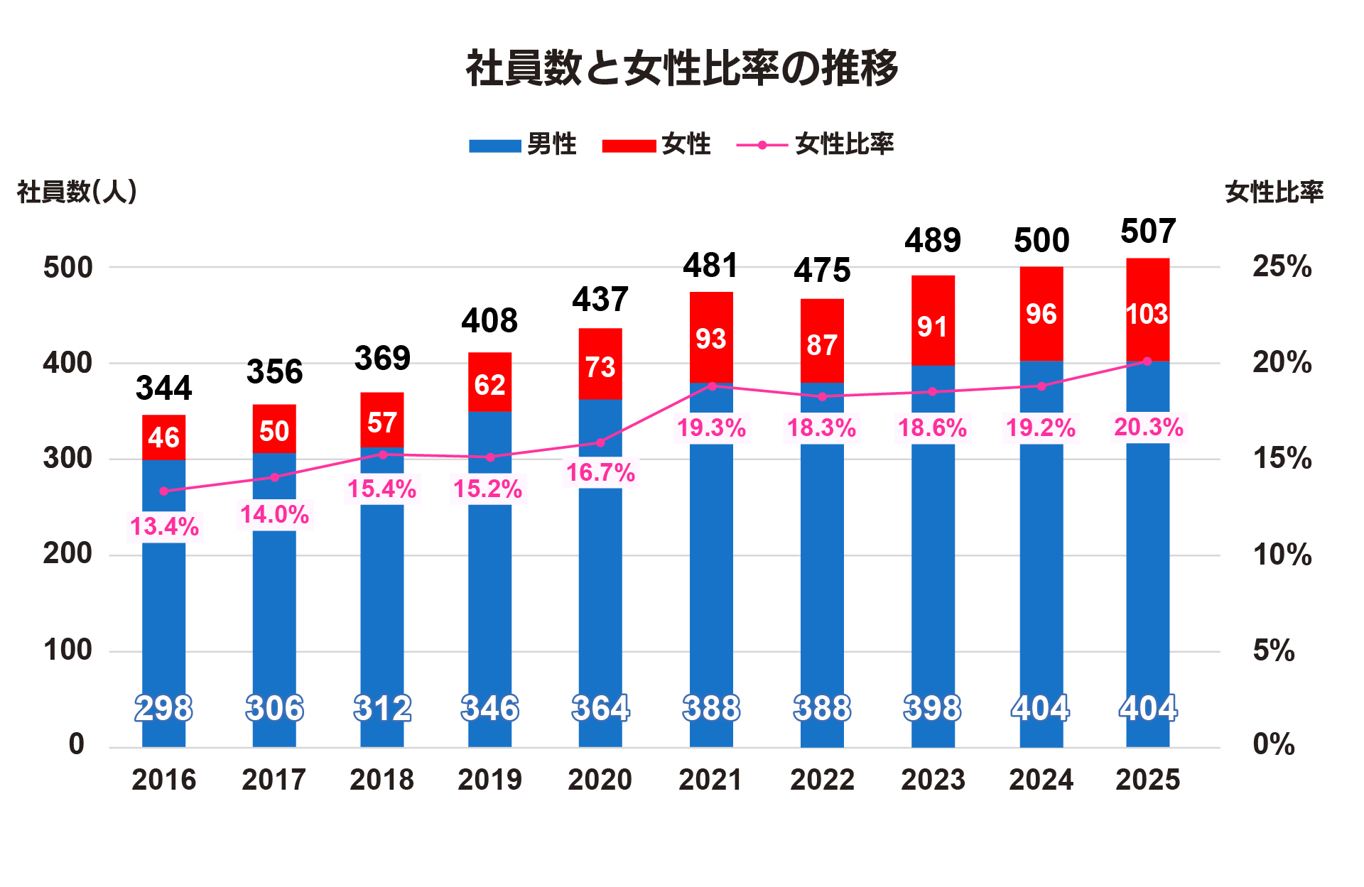 GIKENグループは、女性が活躍する魅力的なグローバル企業を目指すため、また深刻化する労働力不足にそなえるため、女性管理職の育成、女性の人材採用に力を入れています。